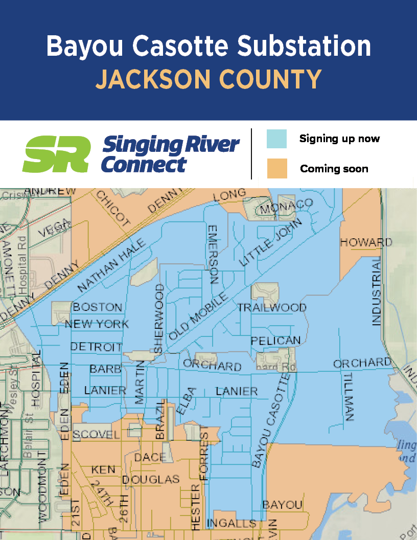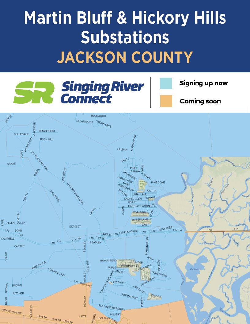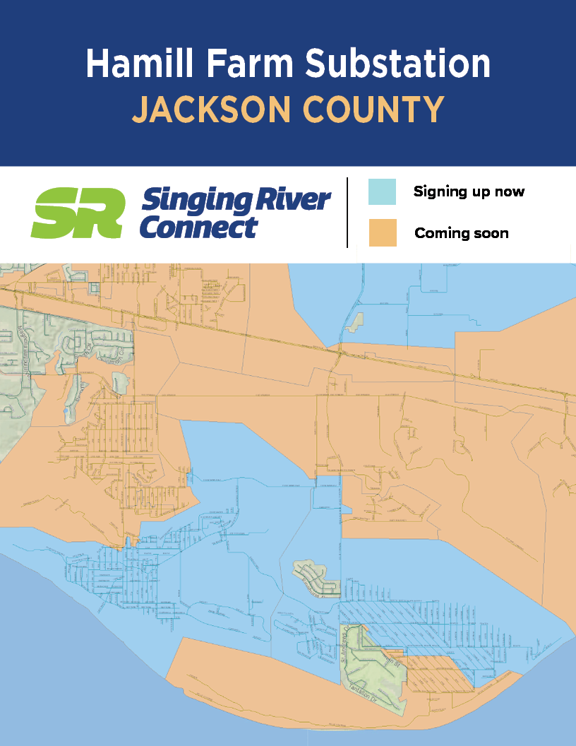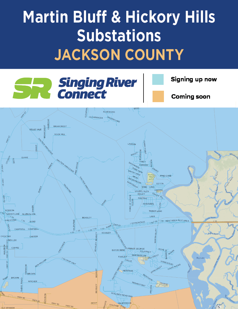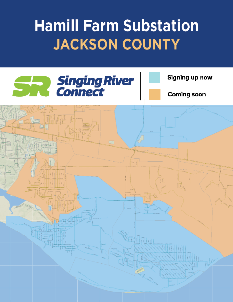 See the maps below for active SR Connect fiber service areas. To find out which electric substation serves you, text a member service representative at 228-591-9166.